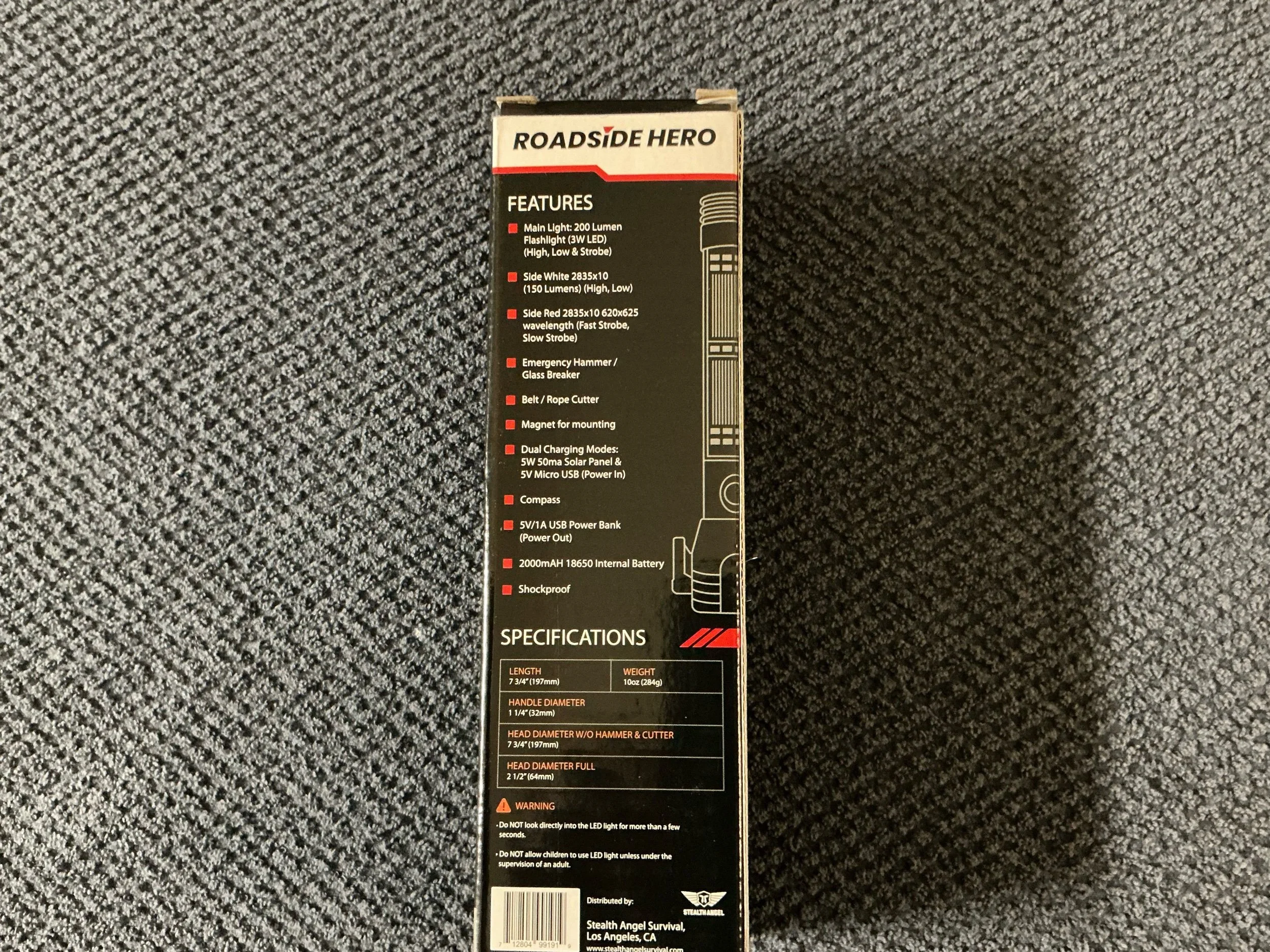 Emergency flashlight, hammer, glass breaker, belt/rope cutter, compass, magnet for mounting, dual charging modes, 5v/1a USB power bank out. A great addition to your bug out bag.